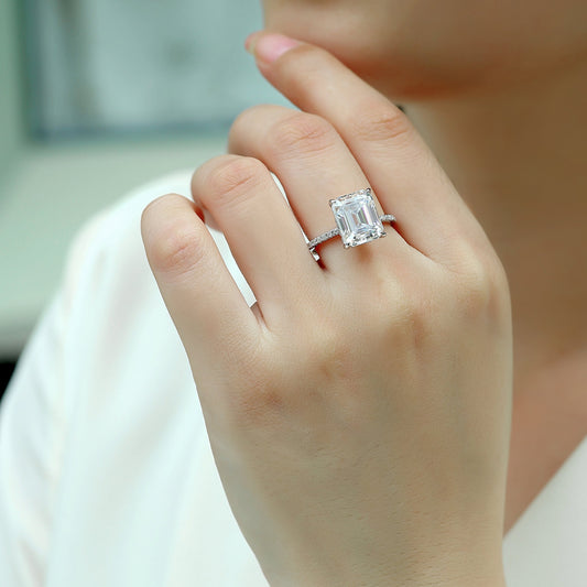 4 Carat Emerald Cut Moissanite Engagement Ring for Women – Half Coverage Classic Design, 30 Side Stones, Sterling Silver with 18K White Gold Plating