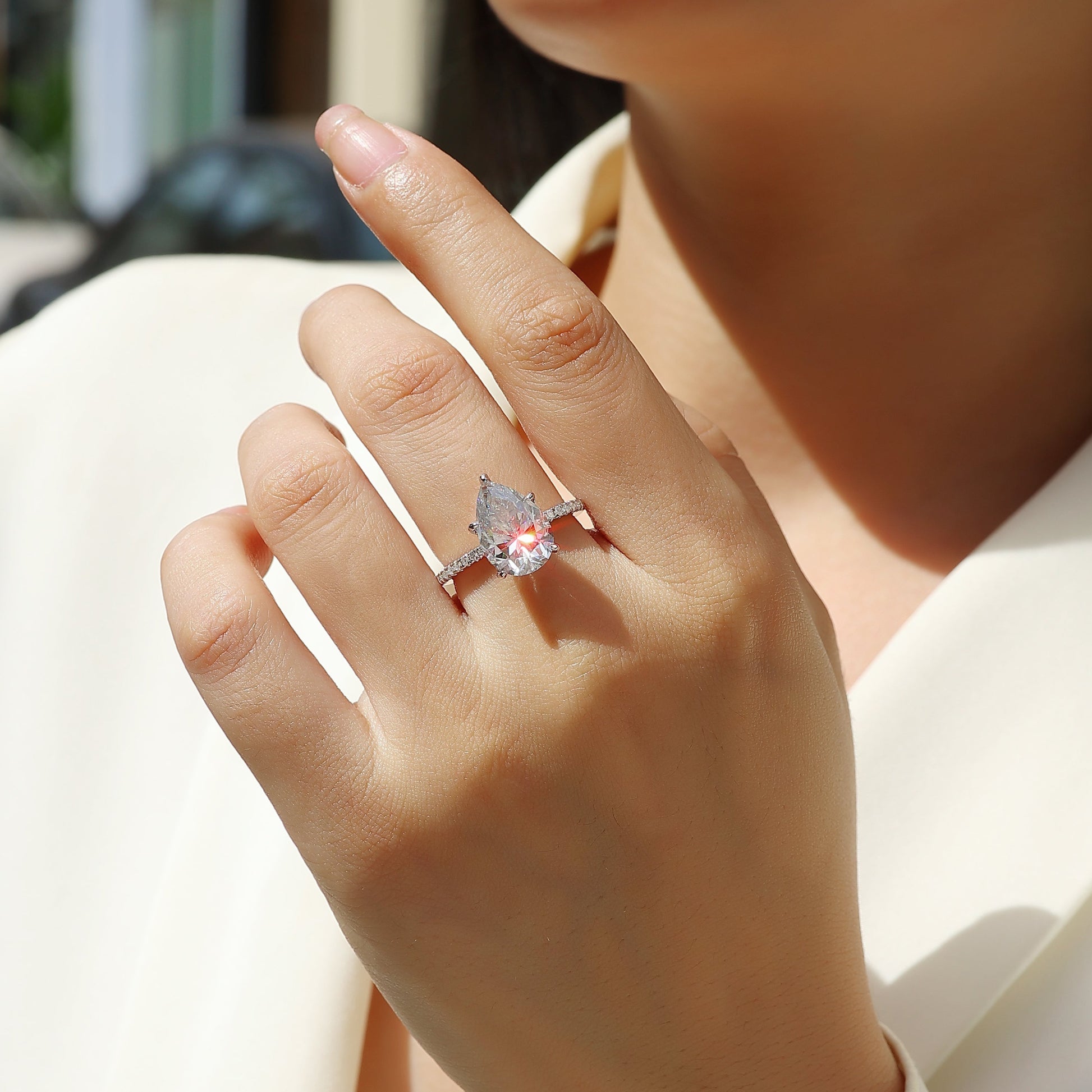 The elegant pear shape symbolizes tears of joy and everlasting devotion—making it the perfect choice for those who believe love should shine boldly and beautifully. Crafted in 925 sterling silver and finished with 18K white gold plating, this ring embodies timeless sophistication with a modern edge. Whether it’s an engagement, anniversary, or a special gift, this piece is designed to shine as bright as the woman who wears it.